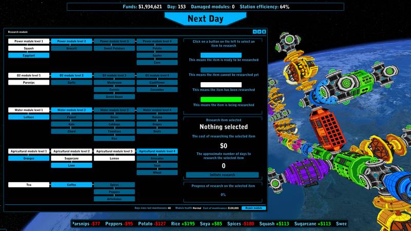 В качестве реализатора этой идеи выступила компания «Xiotex Studios». Она доверила управление целой космической станцией своим пользователям и надеется, что им придет по вкусу работа с современными модулями станции, а также возможность использовать любые ресурсы: воду, людей, кислород и энергию в неограниченном количестве. Для решения всех проблем важно грамотно подходить к анализу финансовых рынков и политических ситуаций. Это поможет развить экономику на станции и изучить новые виды урожайных культур.